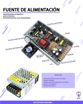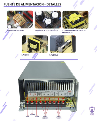 Dimensiones: 24cmx12,5cmx7cm Made in China - Marca Makerparts - El consumo maximo en AMP es de a picos. En el caso de usarla de forma constante el valor maximo en corriente es el 50% y se recomienda agregar un ventilador para su mayor durabilidad.
