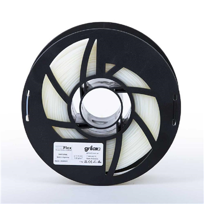 El filamento Flex de Grilon3® conforma la familia de materiales técnicos al ser un caucho sintético de aplicación en 3D que permitirá al usuario generar piezas elastoméricas y flexibles, resultando más que idóneo para fabricar topes, bujes flexibles, plantillas de calzado, zapatillas, ruedas neumáticas, pulseras de relojes y mucho más.