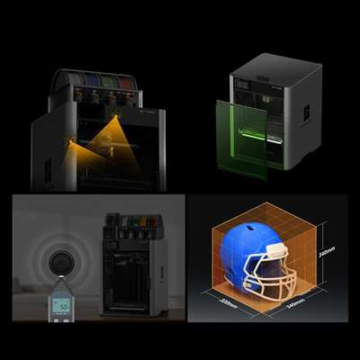 Equipada con un hotend de 350 °C y cámara calefaccionada a 65 °C, soporta filamentos de ingeniería (PC, PPA, entre otros) con mínima deformación y excelente adhesión. Sensores avanzados controlan la presión de la boquilla y optimizan superficies y bordes.